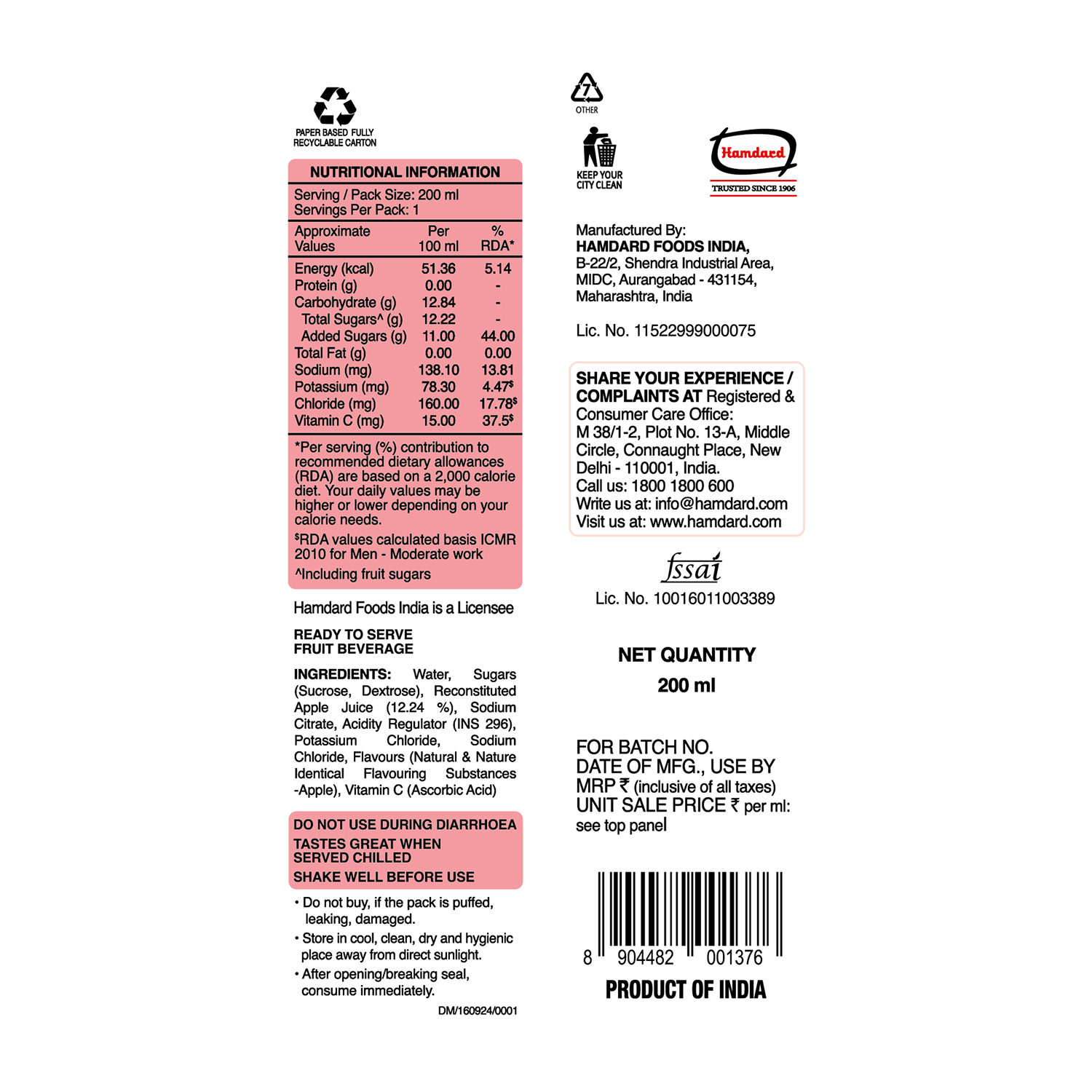 | SERVING/ PACK SIZE: 200 ML | SERVINGS PER PACK : 1 | |