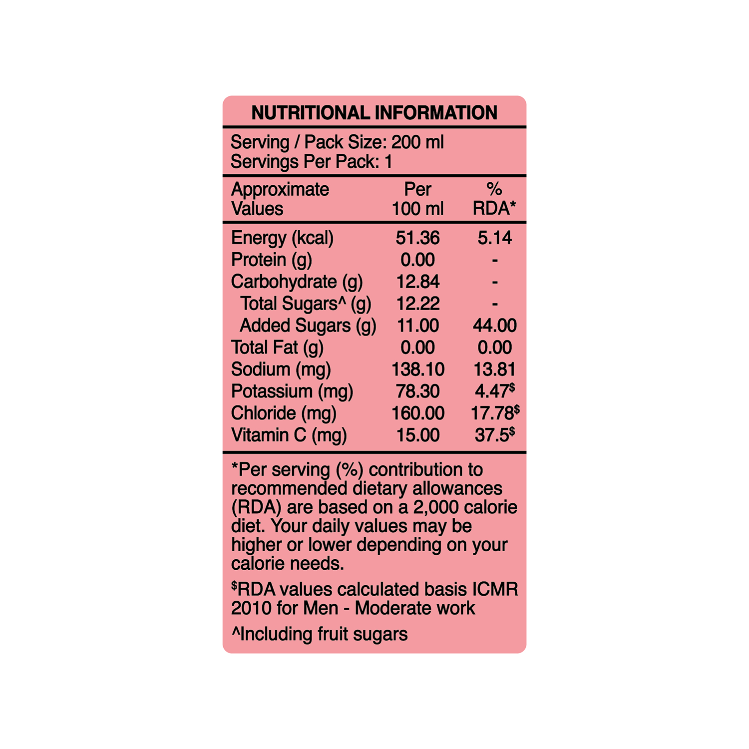 *Per serving (%) contribution to recommended dietary allowances (RDA) are based on a 2,000 calorie diet. Your daily values may be higher or lower depending on your calorie needs. $RDA values calculated basis ICMR 2010for Men - Moderate work ^including fruit sugars |
