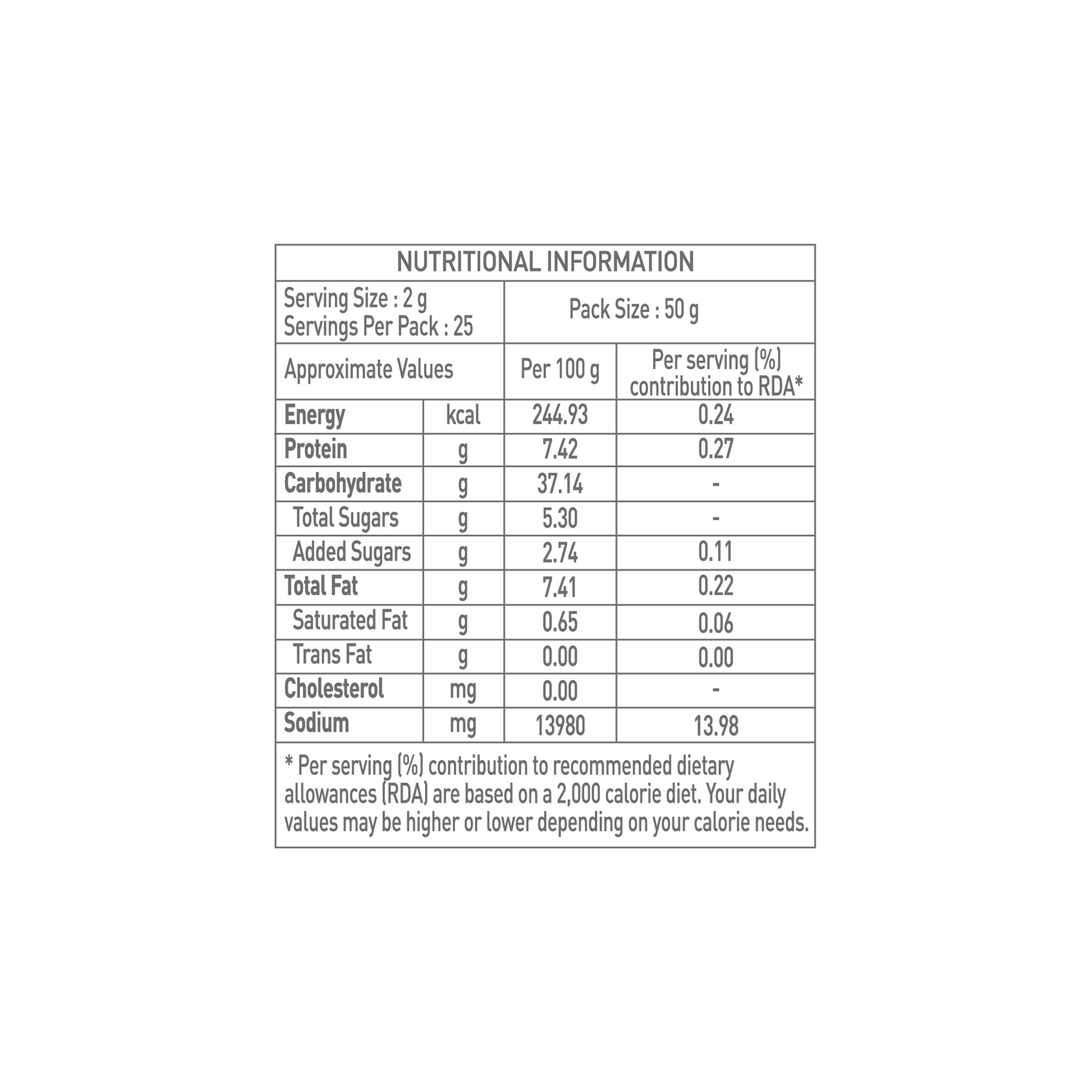 | SERVING SIZE : 2 g SERVING PER PACK : 50 |
