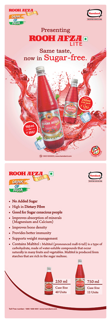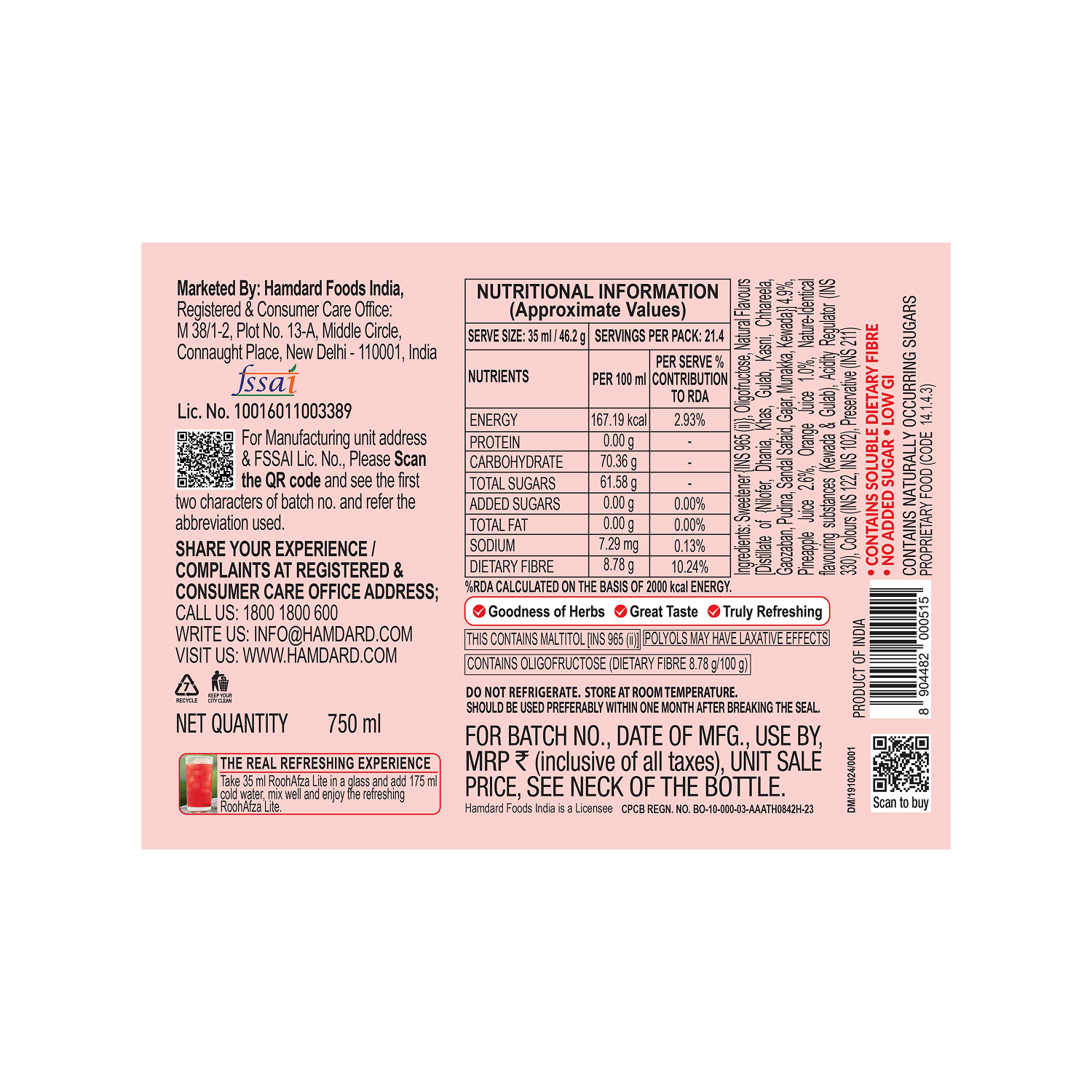 • RoohAfza LITE Contains less calories compared to market available Sharbats.