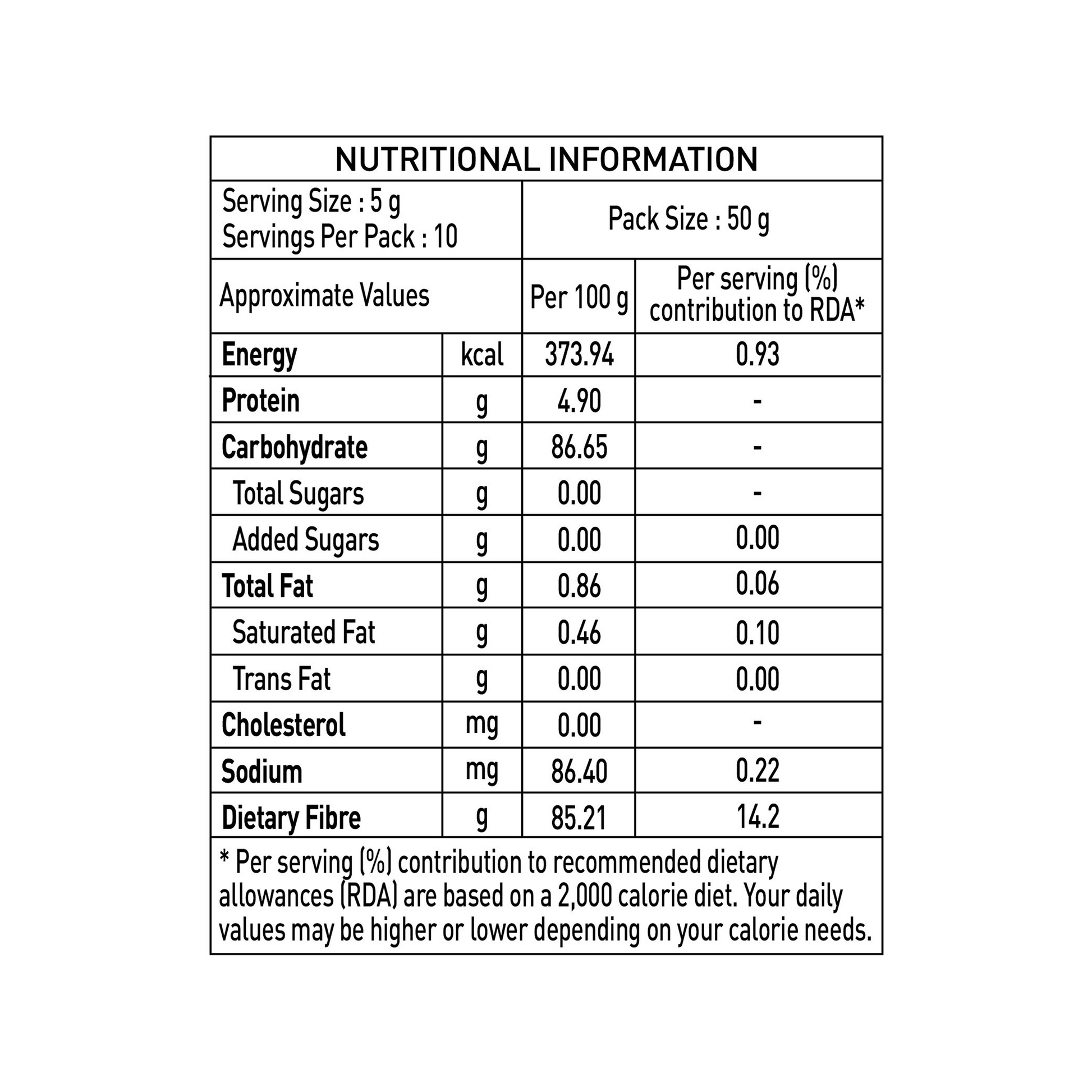 | Dietary Fibre | 85.21 g | 14.2% |